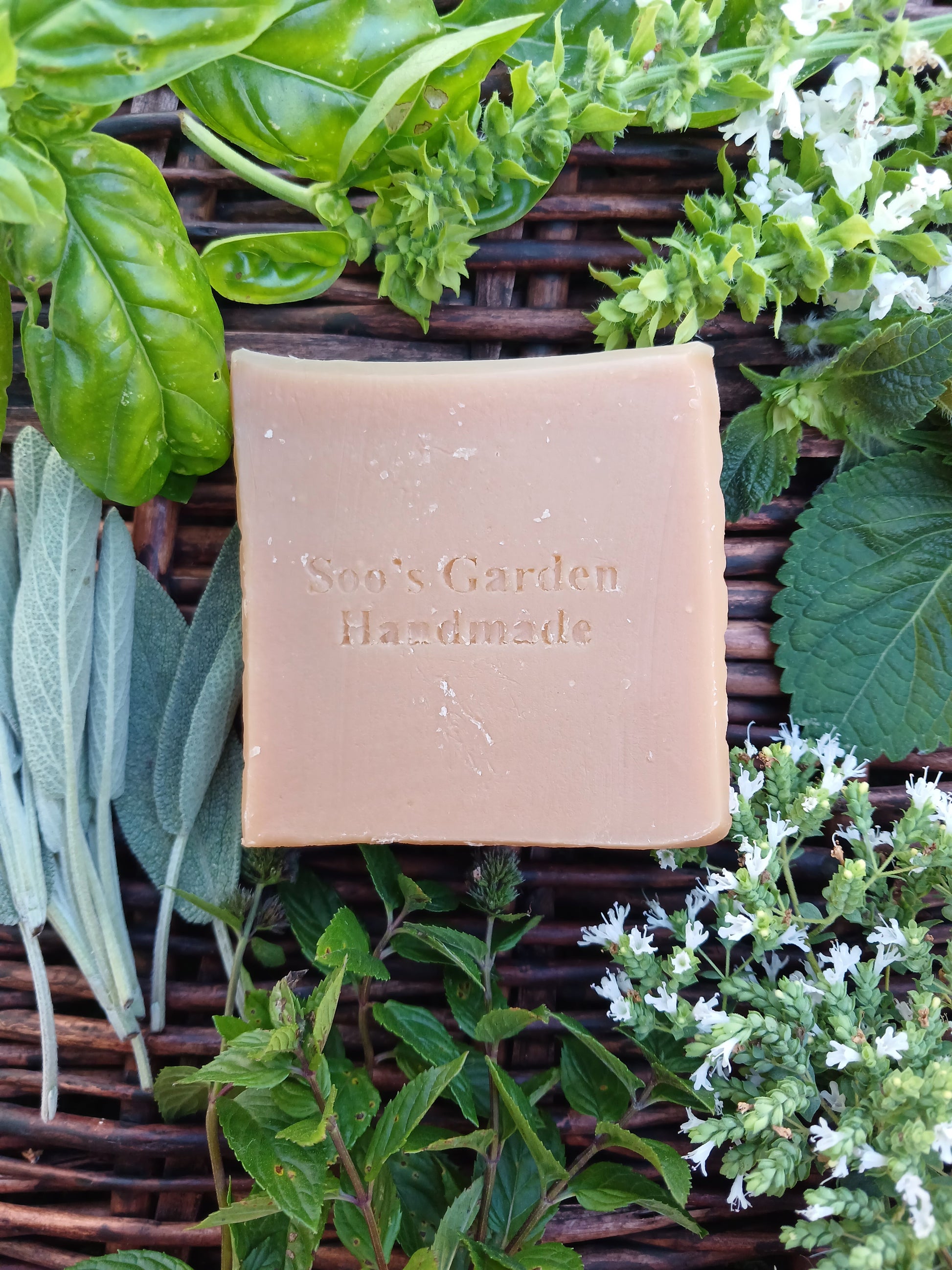 Made with saponified certified organic extra virgin olive, certified organic coconut, certified organic castor oils, certified organic cocoa butter, certified organic shea butter, lanolin, organic beeswax, certified organic hemp seed, certified organic jojoba oils, organically grown rosemary, nettle, hops, thyme, sage, mint, oregano, tea tree, basil, perilla, certified organic eucalyptus & certified organic cedarwood essential oils